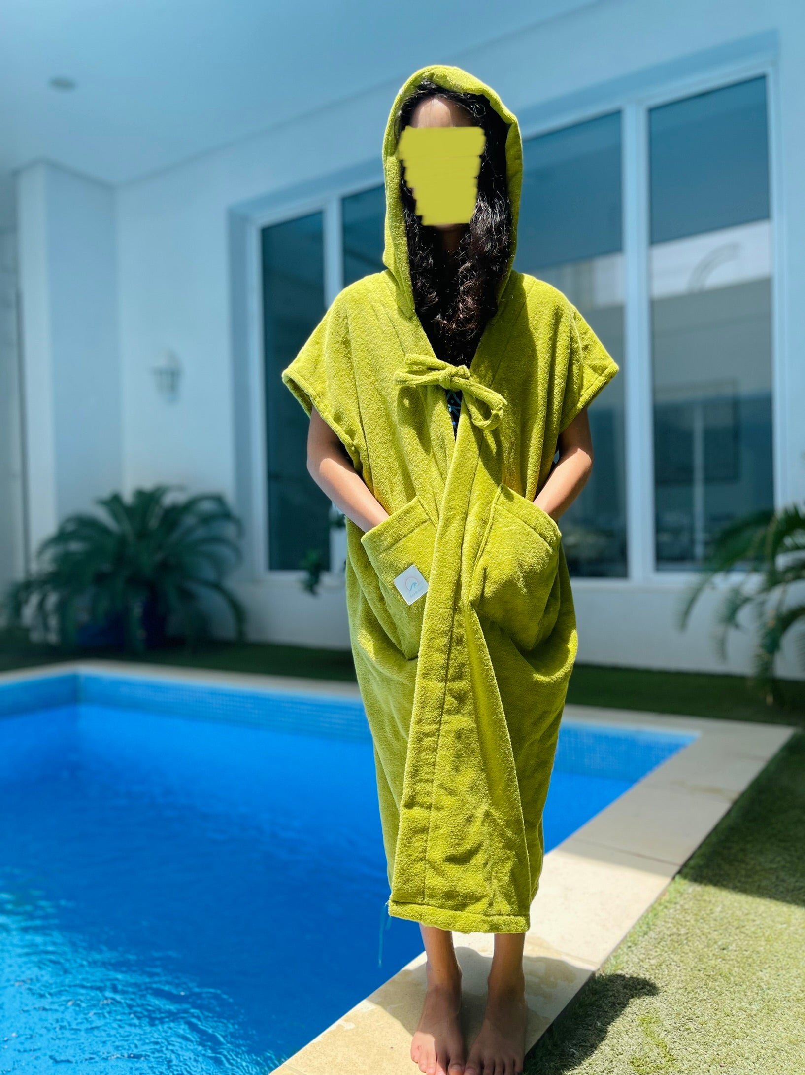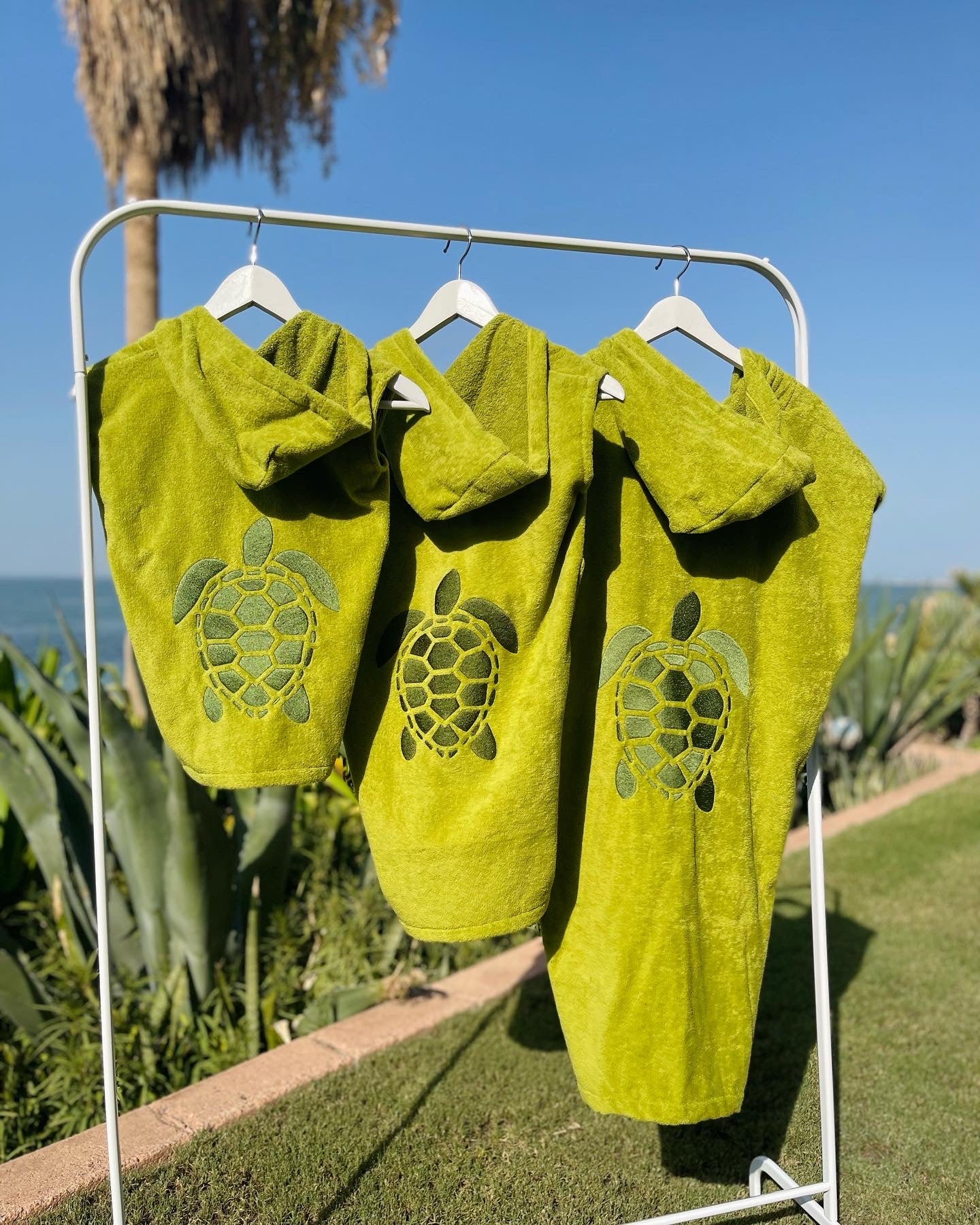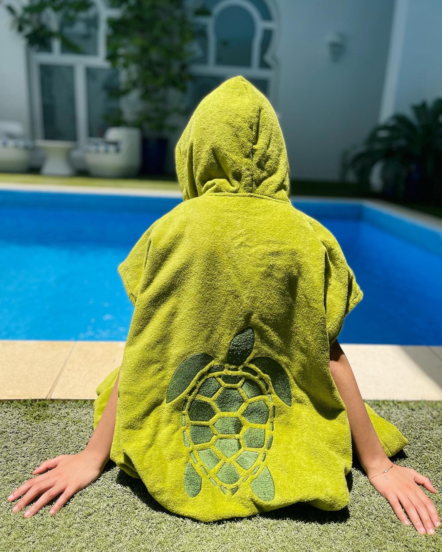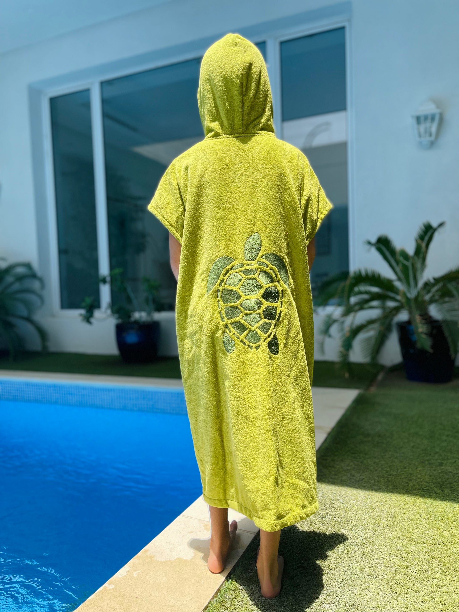 Cute, cozy, and made just for your little one! Our Kids' Green Towel Bisht is the perfect cover-up after a swim, bath, or splashy adventure. Made from soft, absorbent towel fabric and finished with turtle embroidery, it’s as comfy as it is adorable. Featuring short sleeves and a hoodie for extra comfort.