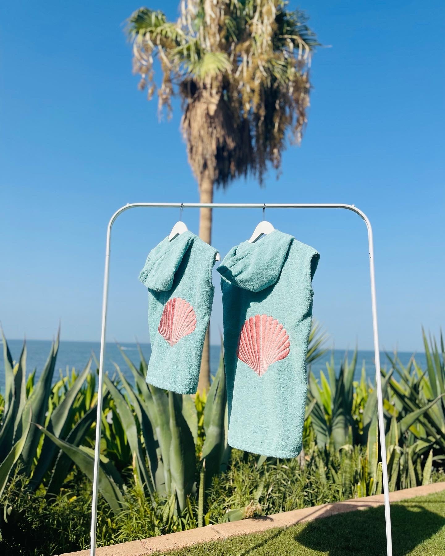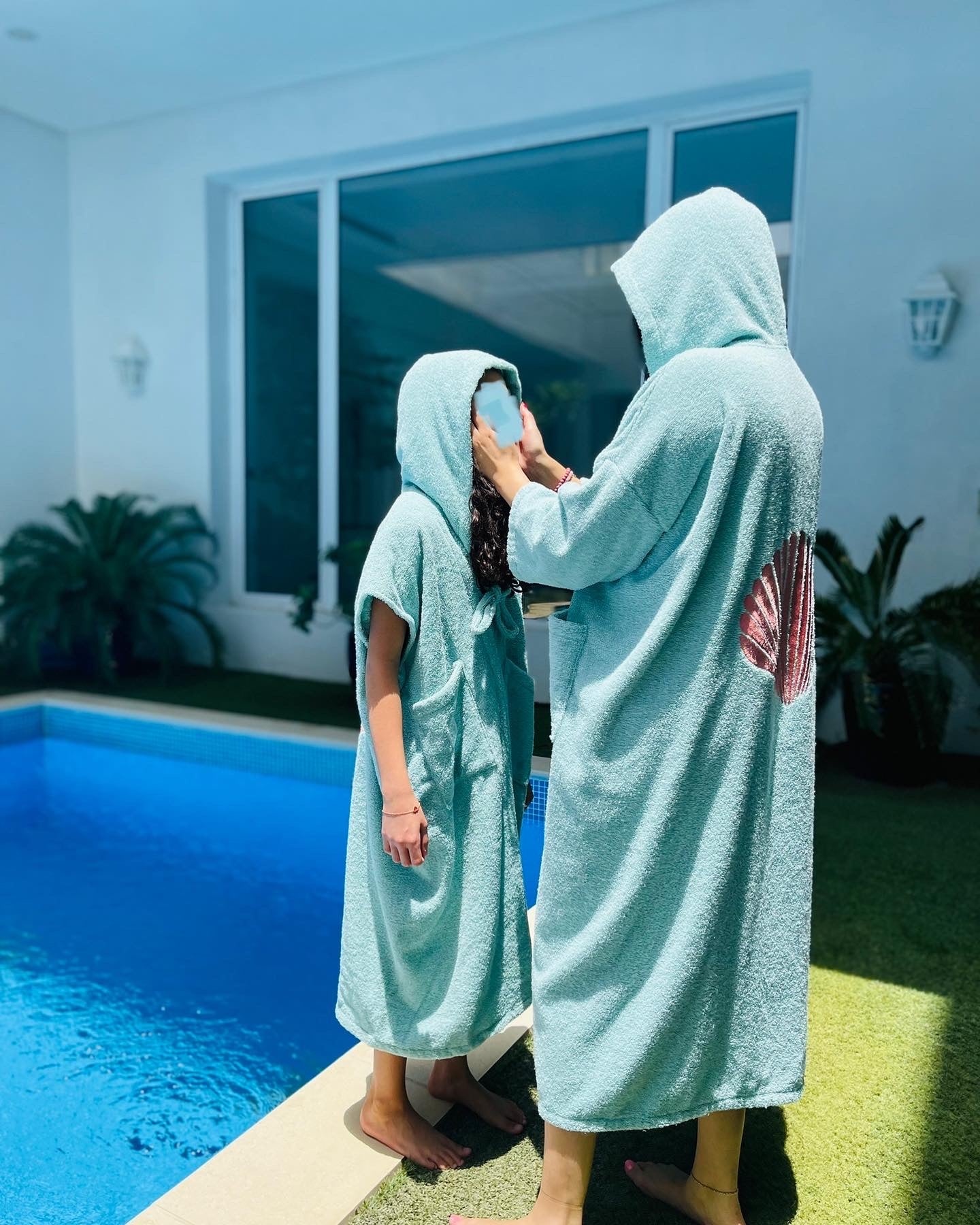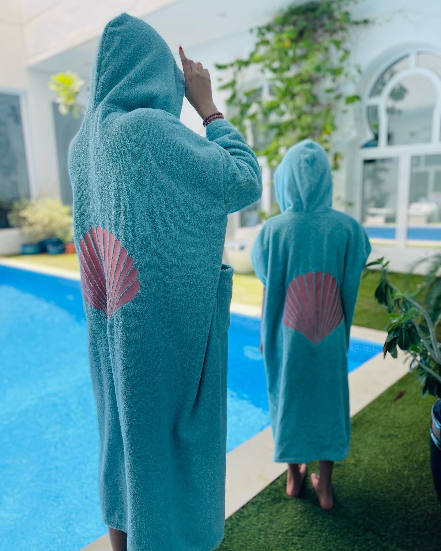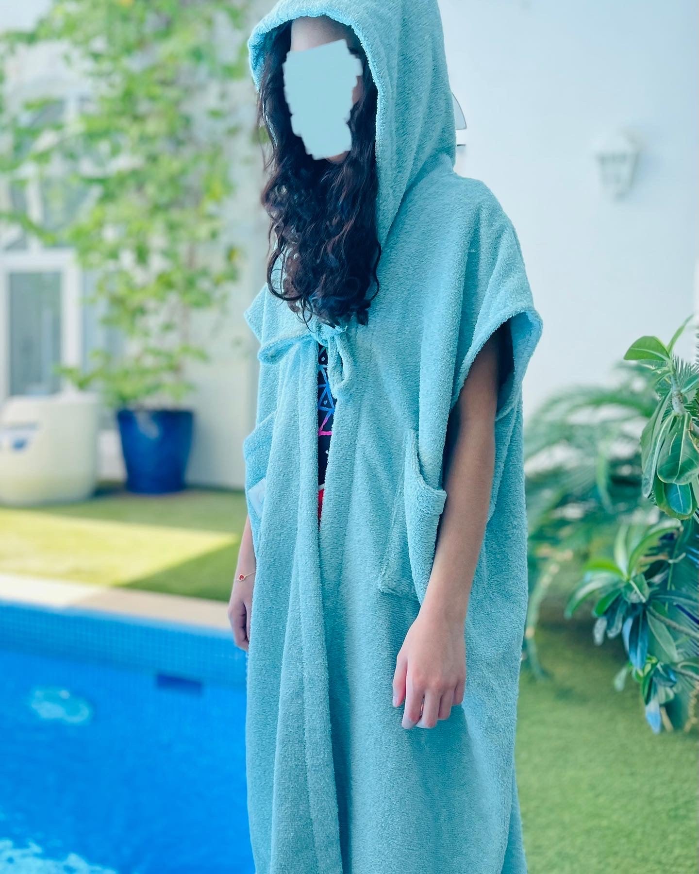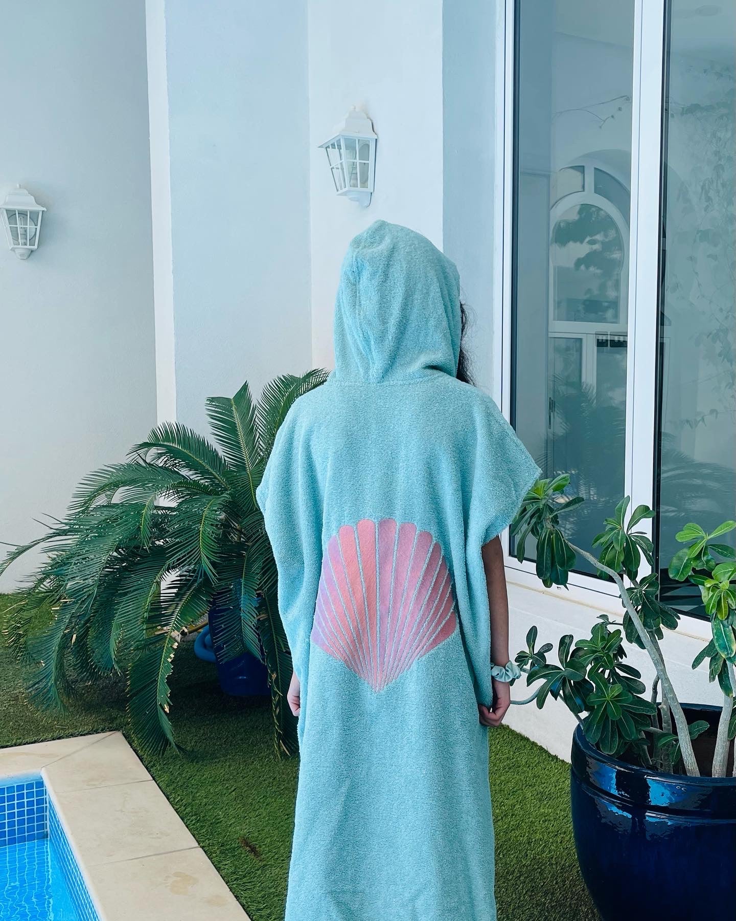 Cute, cozy, and made just for your little one! Our Kids' Pastel Blue Towel Bisht is the perfect cover-up after a swim, bath, or splashy adventure. Made from soft, absorbent towel fabric and finished with pink shell embroidery, it’s as comfy as it is adorable. Featuring short sleeves and a hoodie for extra comfort.