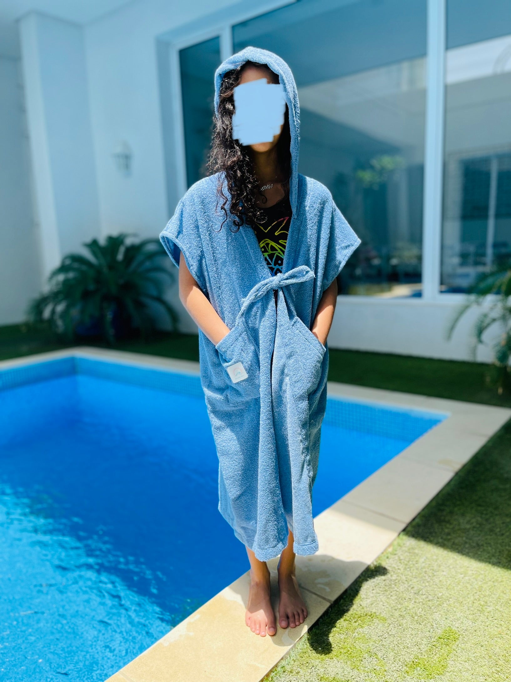Cute, cozy, and made just for your little one! Our Kids' Blue Towel Bisht is the perfect cover-up after a swim, bath, or splashy adventure. Made from soft, absorbent towel fabric and finished with shark embroidery, it’s as comfy as it is adorable. Featuring short sleeves and a hoodie for extra comfort.