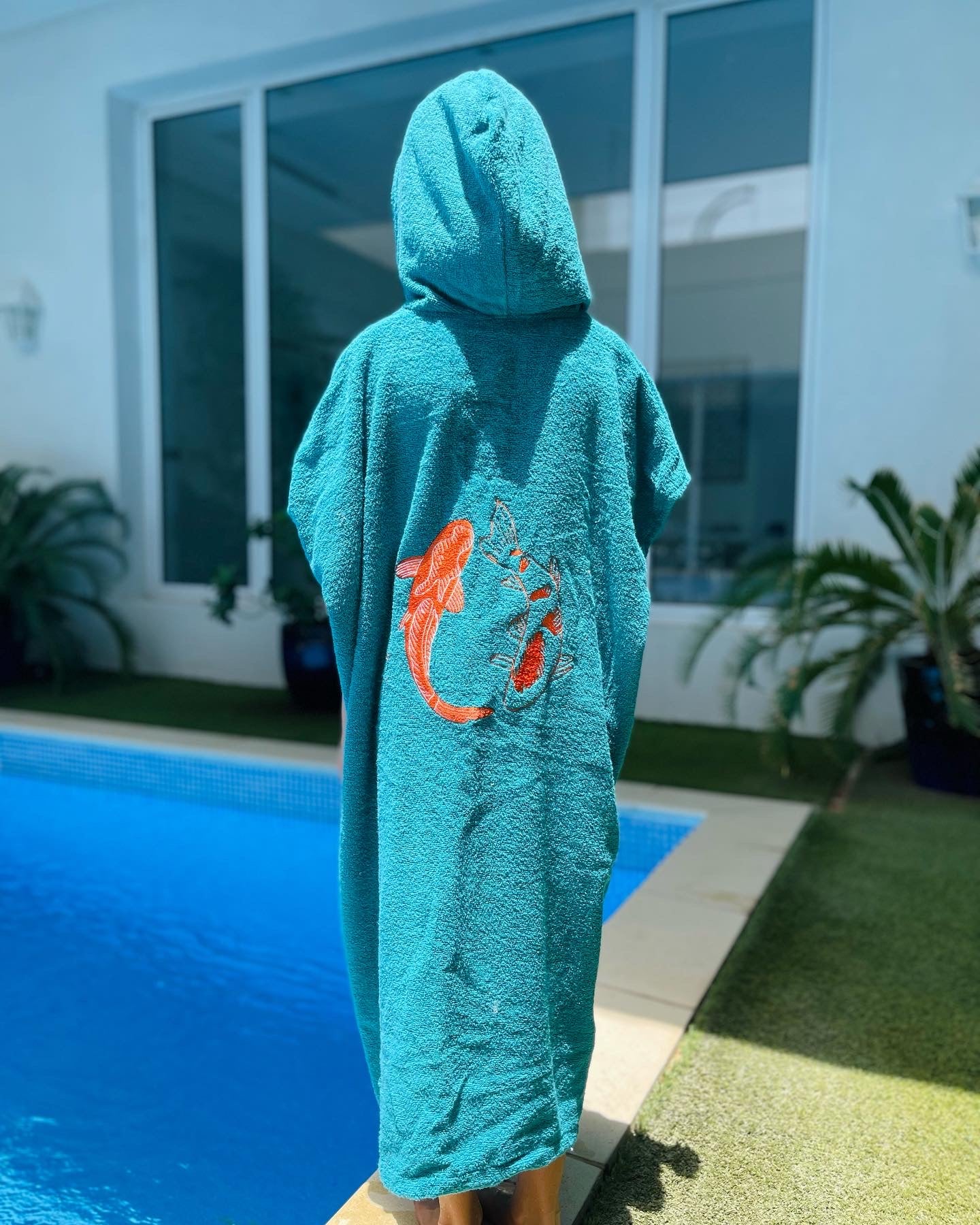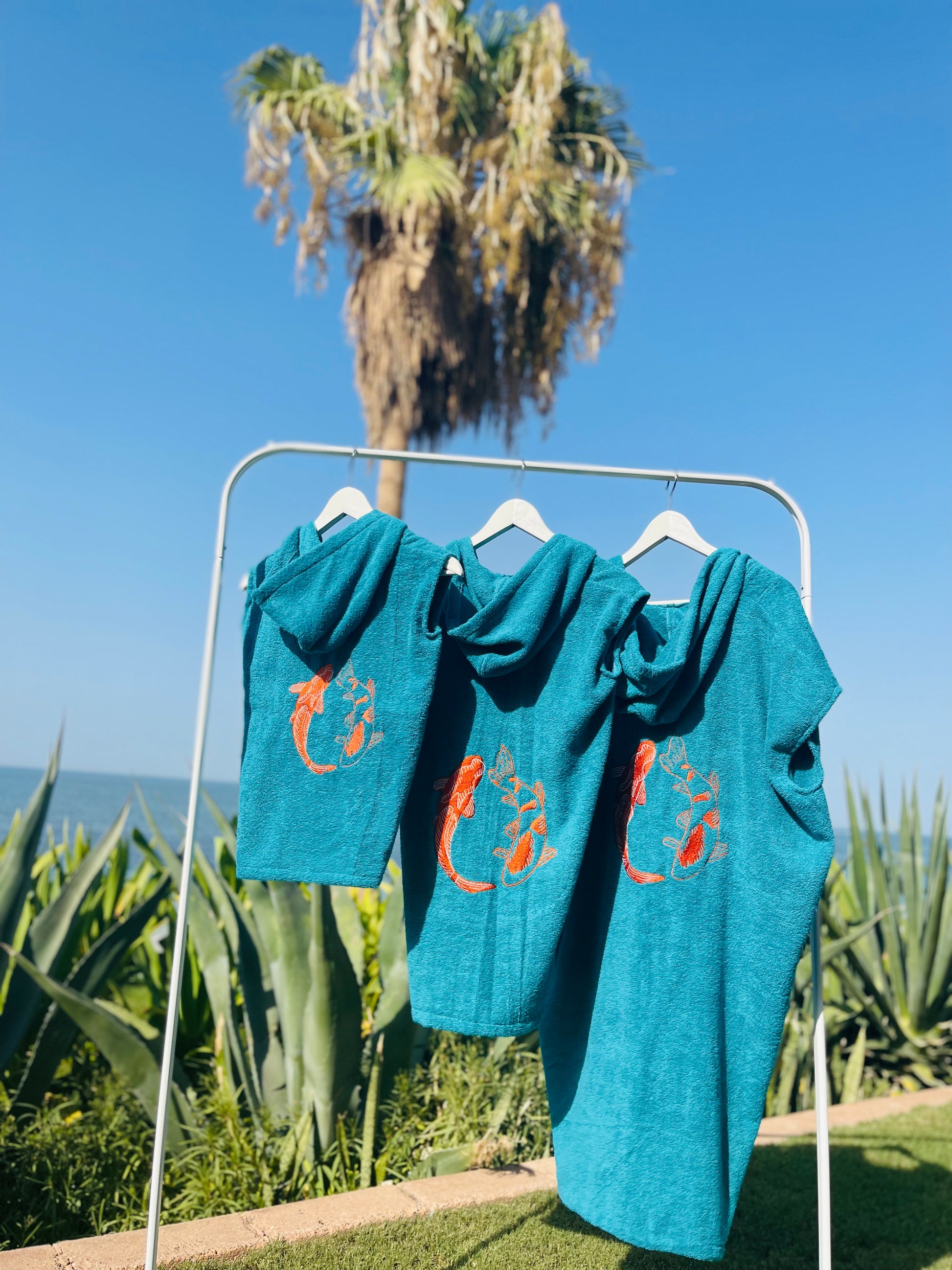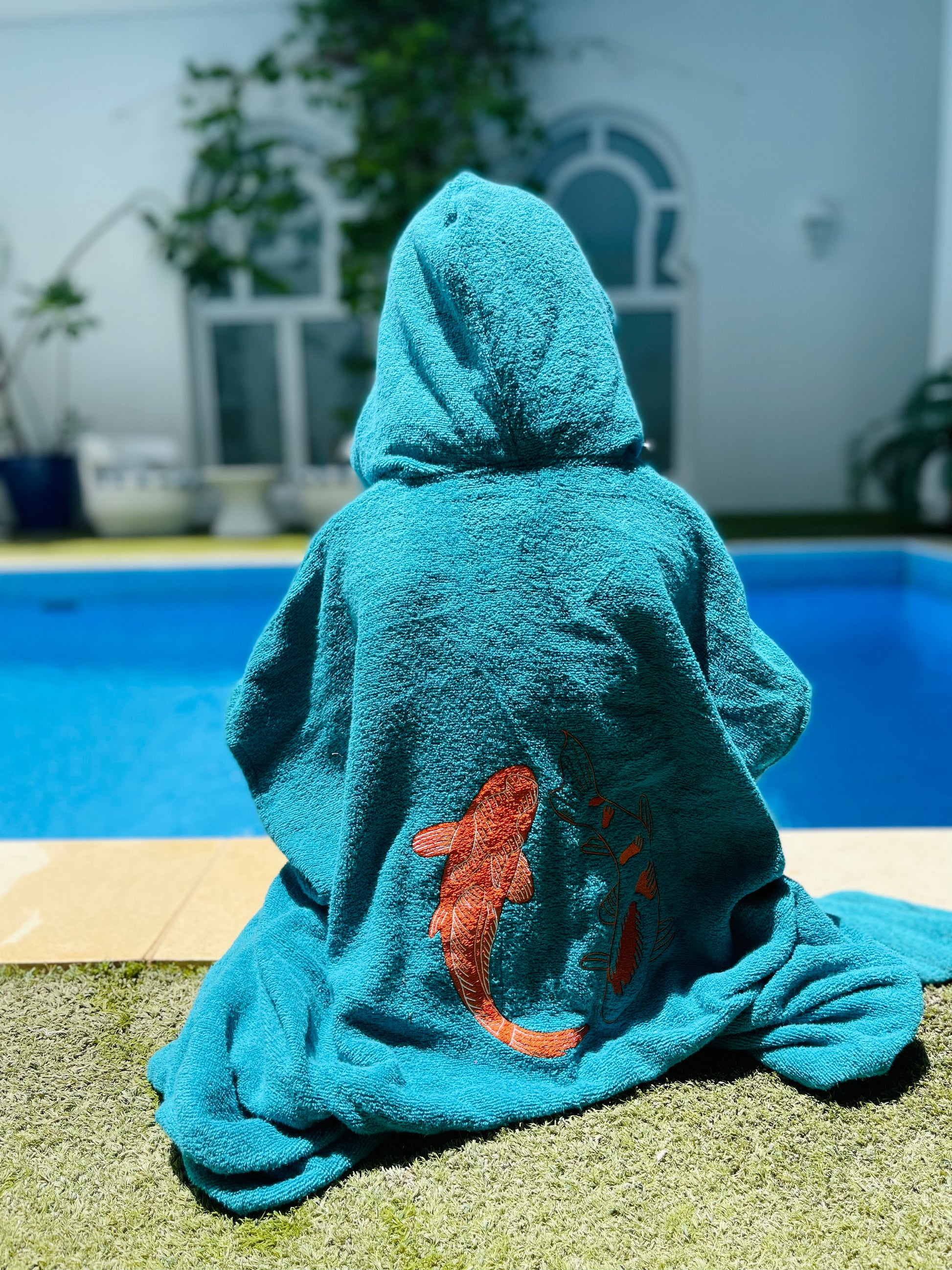 Cute, cozy, and made just for your little one! Our Kids' Turquoise Towel Bisht is the perfect cover-up after a swim, bath, or splashy adventure. Made from soft, absorbent towel fabric and finished with fish embroidery, it’s as comfy as it is adorable. Featuring short sleeves and a hoodie for extra comfort.