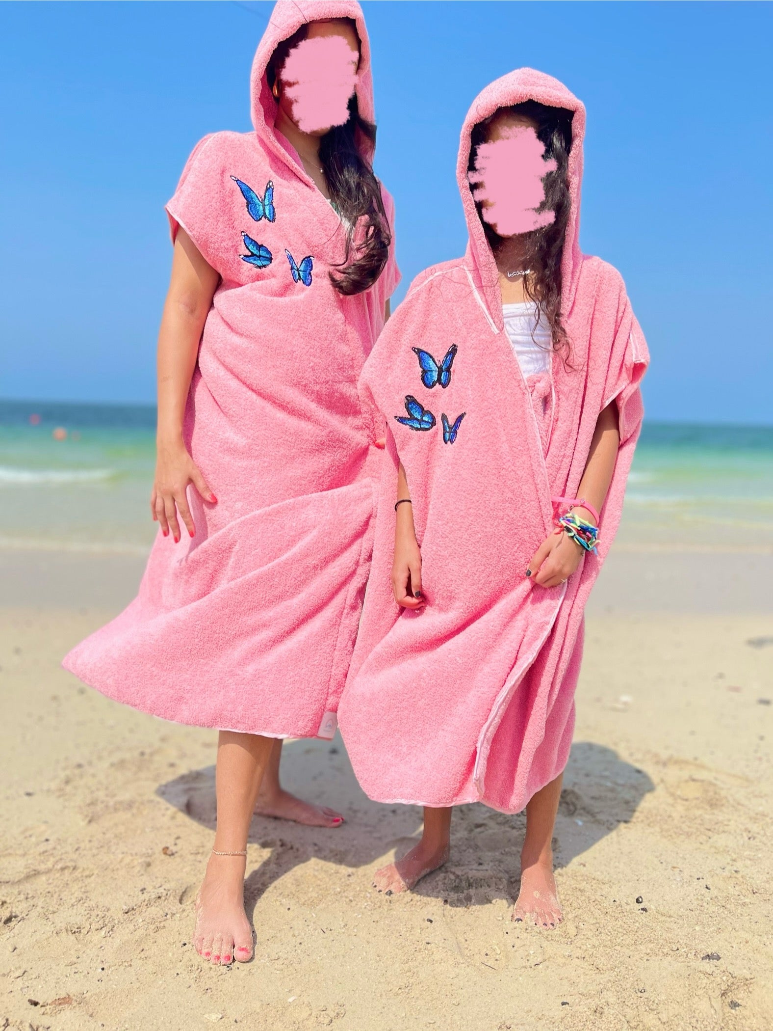 Wrap yourself in comfort and charm with our Pink Towel Bisht! Crafted from soft, absorbent towel fabric, this cozy cover-up is perfect for beach days or poolside lounging. Featuring short sleeves and a hoodie for extra comfort.
