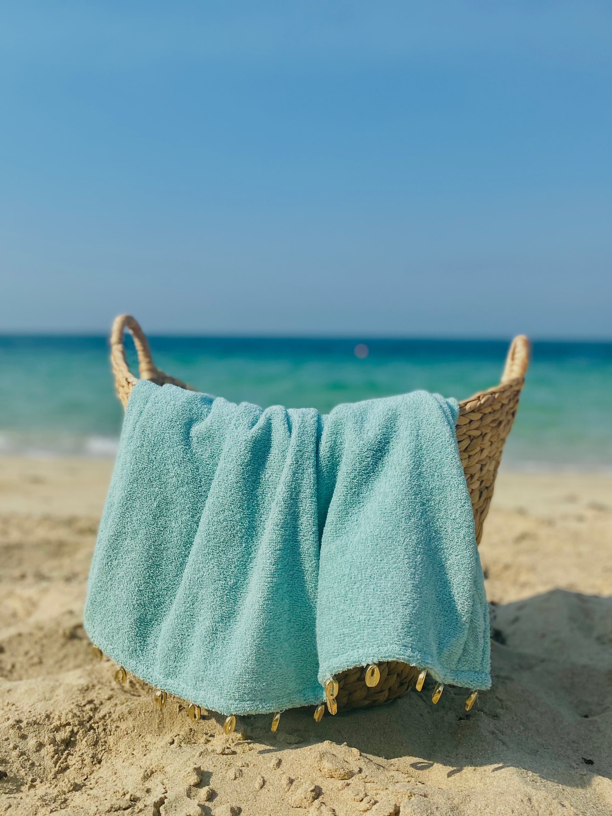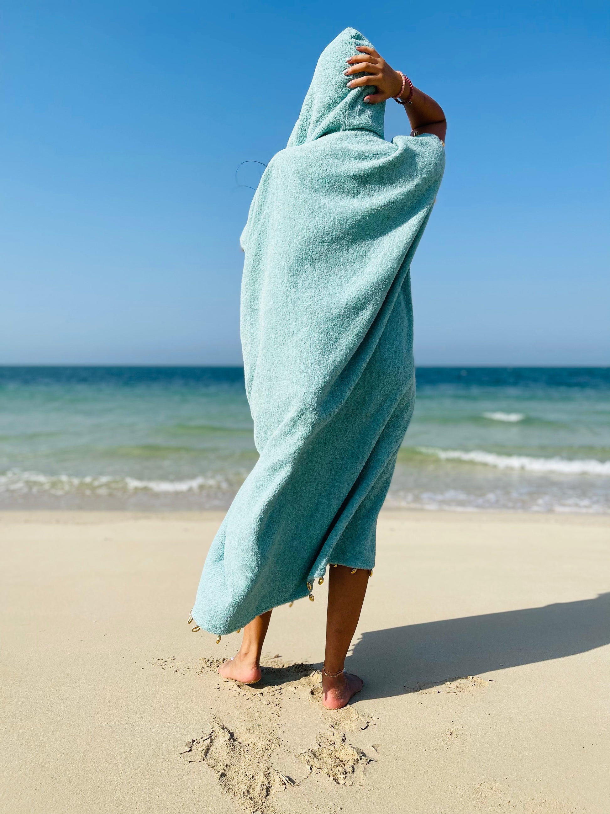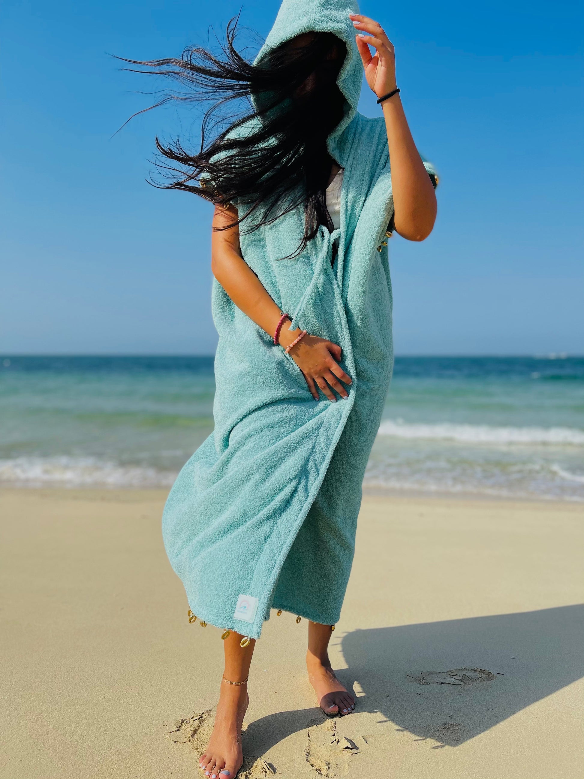 Wrap yourself in comfort and charm with our Tiffany Blue Towel Bisht! Crafted from soft, absorbent towel fabric, this cozy cover-up is perfect for beach days or poolside lounging.